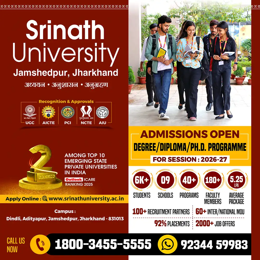 जनसंवाद, जमशेदपुर। जमशेदपुर स्थित श्रीनाथ विश्वविद्यालय के छात्रों ने एक बार फिर उत्कृष्ट प्रदर्शन करते हुए गुजरात के अहमदाबाद स्थित प्रतिष्ठित कंपनी जय भारत मारुति लिमिटेड में कैंपस प्लेसमेंट हासिल किया है। इस प्लेसमेंट ड्राइव में कुल 19 छात्रों का चयन हुआ है, जो वर्ष 2023–2026 बैच के हैं।